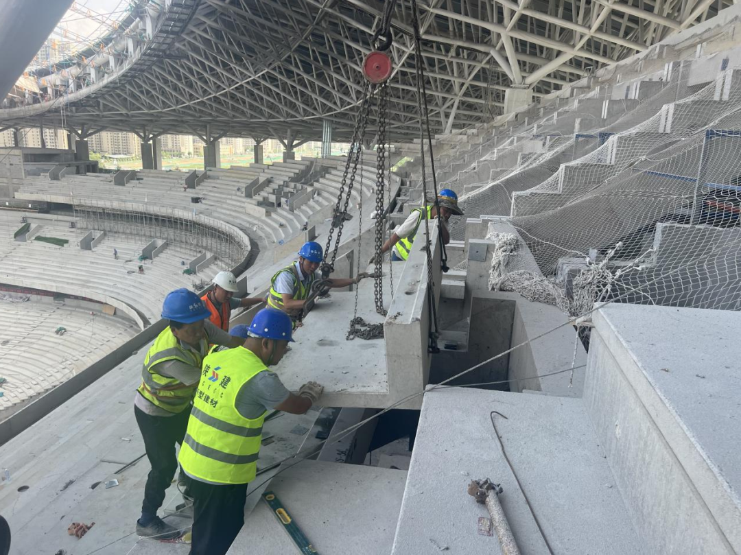 足球中心項(xiàng)目現(xiàn)場(chǎng),預(yù)制看臺(tái)吊裝進(jìn)入到最后也是最難的高區(qū)吊裝環(huán)節(jié),場(chǎng)館屋頂索網(wǎng)施工完成后,對(duì)高區(qū)看臺(tái)吊裝來說更是嚴(yán)峻的挑戰(zhàn),斜角吊裝,角度稍有偏差,就可能碰到頂部鋼索或傷到安裝工人,烈日“炙烤”下,更需要作業(yè)人員沉著冷靜、膽大心細(xì),嚴(yán)格按照施工工藝要求,做到盡善盡美,完美實(shí)現(xiàn)設(shè)計(jì)方高標(biāo)準(zhǔn)要求。